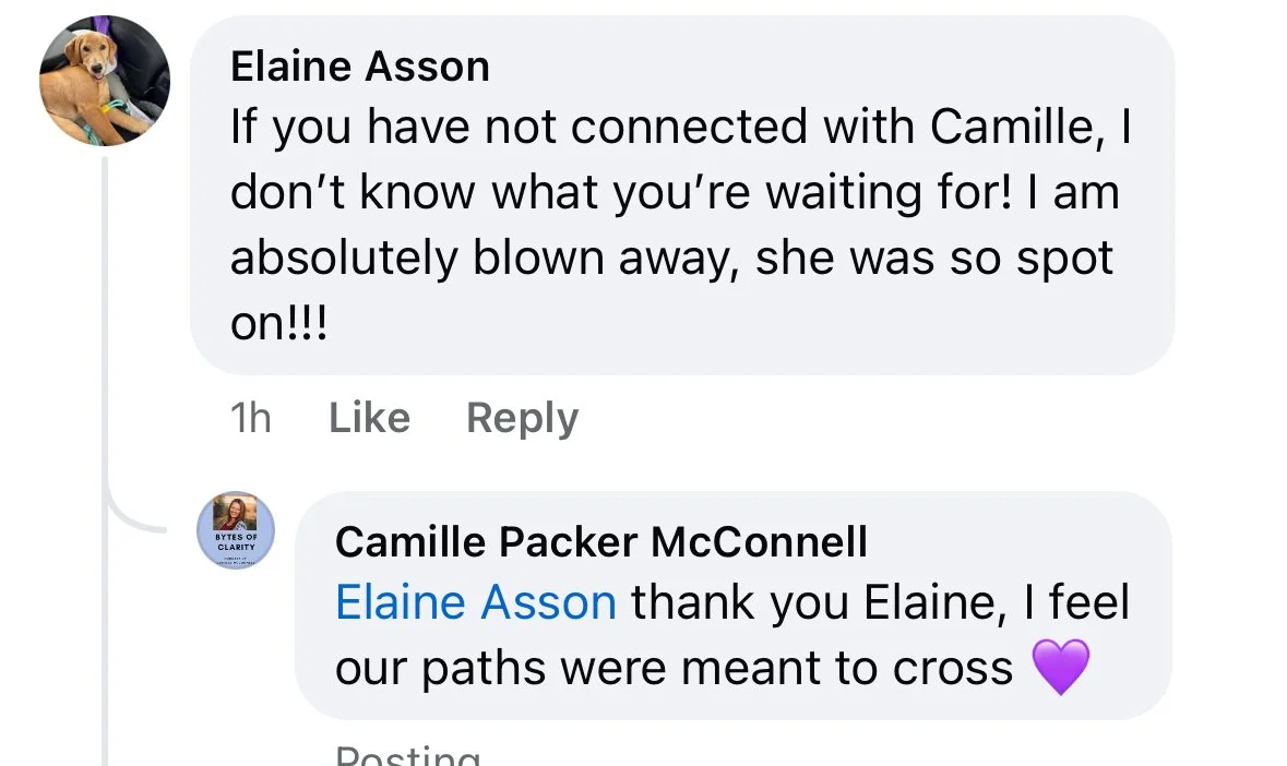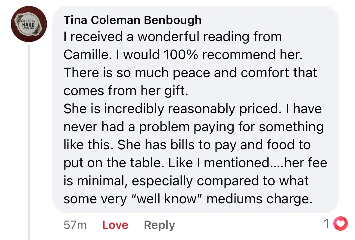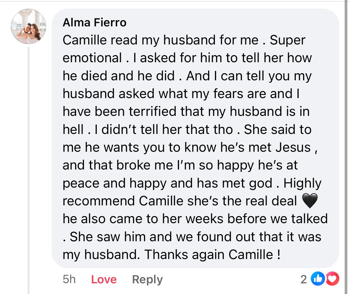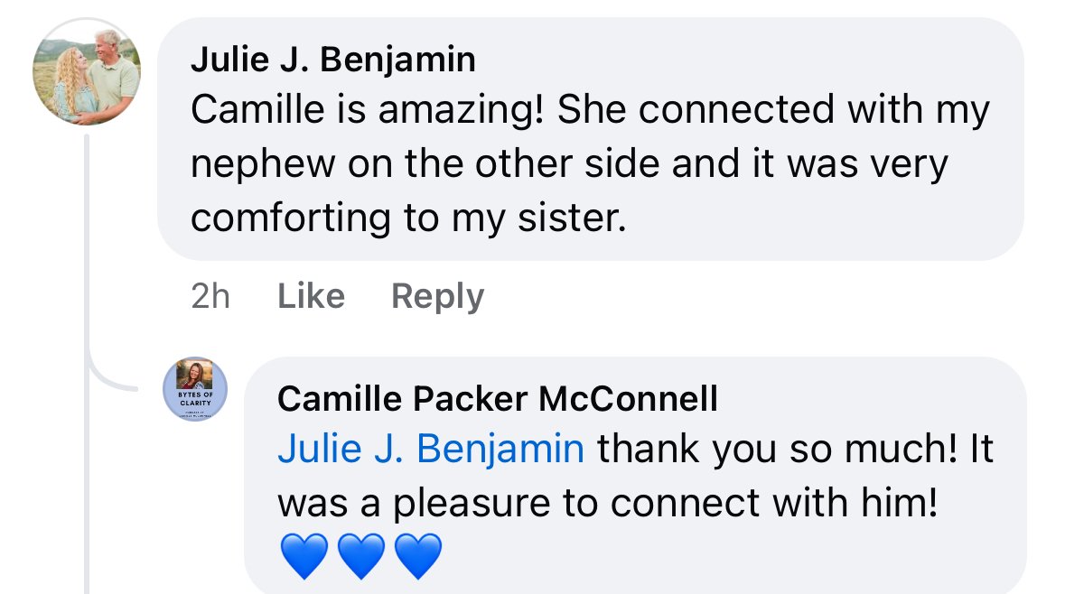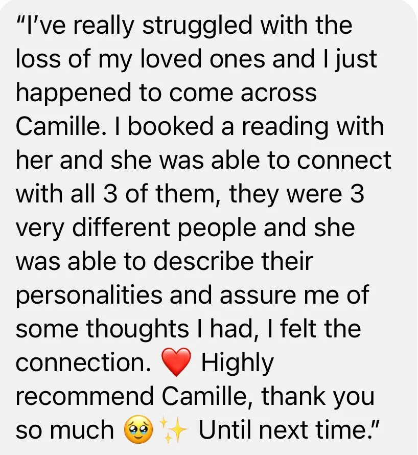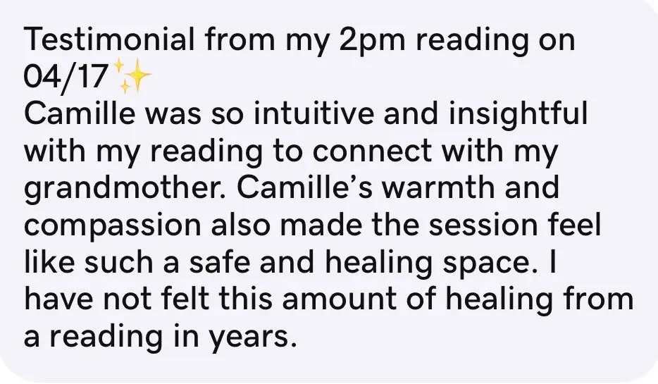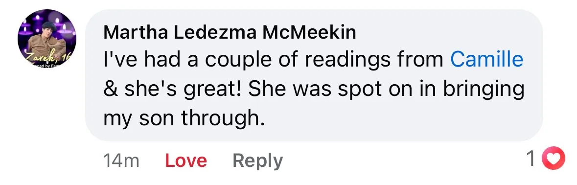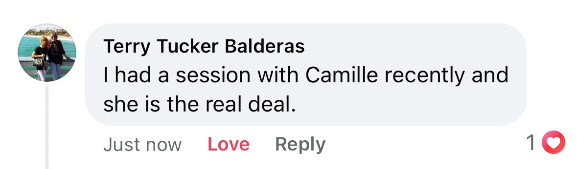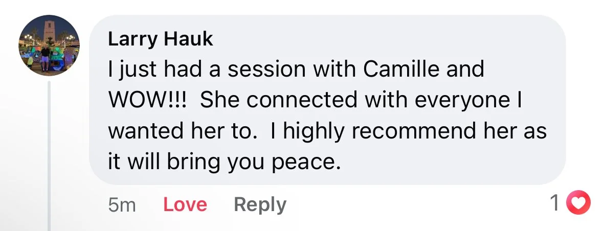 I’m Camille, and I believe we are spiritual beings having an earth life experience. We come from a divine origin and have inherent spiritual wisdom. Our life’s purpose is to learn, grow, love, and walk each other home. Any growth or healing we accomplish in this life, we take with us after we transition AND ripples in both directions, also helping our loved ones on the other side. Connection adds light to the world.